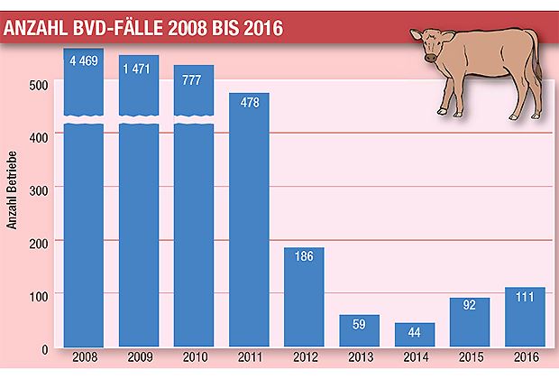 2016 haben die Kantone dem BLV insgesamt 111 BVD-Fälle mit total 195 PI-Tieren gemeldet, wobei ein Fall einem Betrieb enspricht. PI-Tiere oder persistent infizierte Tiere sind meist Kümmerer, die das Virus ein Leben lang streuen. Das ist gegenüber 2013 (95 PI-Tiere auf 59 Betrieben), 2014 (148 PI-Tiere auf 44 Betrieben) und 2015 (306 PI-Tiere auf 92 Betrieben) eine klare Zunahme an Betrieben, die von der Seuche betroffen sind.