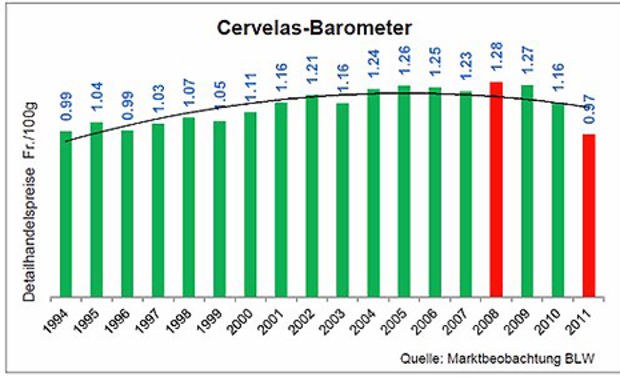 2011 kosteten 100 Gramm Cervelat nur gerade 97 Rappen. Das ist der günstigste Preis seit das BLW den Cervelat-Barometer führt.