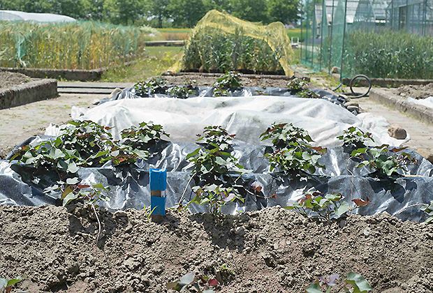 Der Versuch von Agroscope hatte das Ziel, verschiedene Methoden für einen raschen Start der Pflanzen gegen Ende Frühling zu testen, wenn die Nachttemperaturen noch tief sind. In Changins wurden zwei Anbaumethoden getestet, um die Temperaturen in den Erdhügeln zu erhöhen. In Versuch 1 wurden die Erdhügel mit schwarzer, mikroperforierter Polyethylen-Folie abgedeckt. In Versuch 2 wurden die Pflanzen mit einem Polypropylen-Vlies versehen. Gestartet wurde der Versuch am 20. Mai mit Setzlingen und Stecklingen.