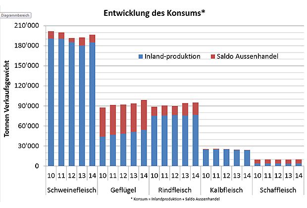 Das mit Abstand beliebteste Fleisch stammte 2014 nach wie vor vom Schwein. Fast die Hälfte des konsumierten Fleischs - 23,66 Kilogramm - war Schweinefleisch. Im Vergleich zum Vorjahr erhöhte sich der Konsum um 0,8 Prozent. Ebenfalls beliebt bei den Konsumentinnen und Konsumenten bleibt Rindfleisch. Durchschnittlich 11,47 Kilogramm (-0,3 Prozent) landeten bei jeder Schweizerin und jedem Schweizer auf dem Teller.