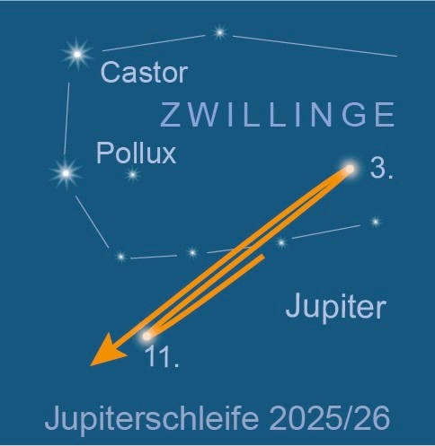 Alle Planeten führen Schleifen aus. Es ist ein perspektivisches Phänomen, wenn die Erde die Planeten überholt oder diese an der Erde vorbeiziehen. Man kennt das gleiche Phänomen, wenn man beispielsweise ein Auto überholt. Dann scheint für einen Moment das Auto in Bezug auf die Landschaft zurückzuwandern. Das geschieht nun mit Jupiter in den Zwillingen. Der ferne Planet beginnt ab dem 11. November rückwärts zu ziehen und wird sich dann bis 11. März 2026 entgegen der üblichen Richtung bewegen.