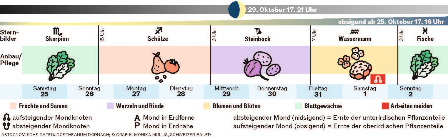 Zudem folgen ab Morgen Fruchttage. Alle Pflanzen, die im Bereich des Samens fruchten wie Bohnen, Soja, Erbsen, Mais, und alle Getreide, werden an Fruchttagen gesät. Ebenso Fruchtpflanzen wie Erdbeeren sowie Obstbäume. Für Lagerobst wird zusätzlich die Phase des aufsteigenden Mondes gewählt.