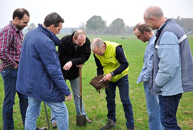 Die anderen Bauern auf dem Feld nicken. "Hat jemand eine Idee, wie das passieren konnte?", fragt Coach Henk Antonissen. "Urin?" "Salz?". Coach Antonissen beantwortet die Frage selbst: "Vielleicht ist zu viel Harnstoff im Urin der Kälber. Das geschieht, wenn man sie nur mit frischem Gras füttert. Der Proteingehalt wird zu hoch und verlässt die Kuh als Harnstoff." Deshalb sei es besser, den Kälbern auch ein wenig Mais zu füttern, erklärt Antonissen den Männern.