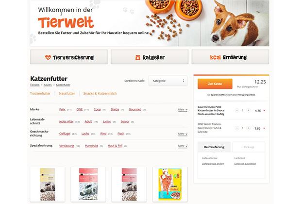 Mit der Lancierung der Tierwelt baut Coop@home sein Dienstleistungs-Angebot weiter aus: Denn dank Kooperation mit der Vaudoise-Versicherung, kann ganz einfach online eine Offerte für die Tierversicherung Animalia angefragt werden - ab 9.30 Franken monatlich für die Katze oder 18.60 Franken für den Hund. Nimmt der Kunde die Versicherung an, gibt es obendrauf noch einen 20-Franken-Einkaufsgutschein von Coop@home.