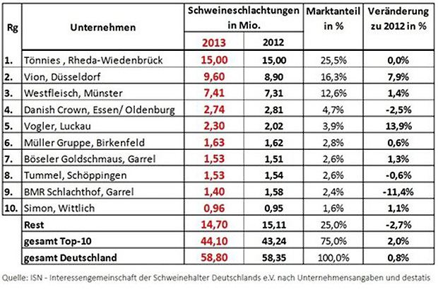 Im letzten Jahr ist der Konzentrationsprozess bei den deutschen Schweineschlachthöfen weiter vorangeschritten. Die zehn grössten Betriebe haben Marktanteile gewonnen.