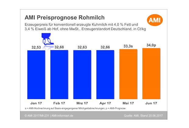 Aufgrund tieferer Milcheinlieferungen sind in Deutschland die Produzentenpreise wieder gestiegen. Die Agrarmarkt Informations-Gesellschaft (AMI) rechnet für Juni mit einem Preis von 34 Cent (37 Rp.) je Kilo. Grund für die höheren Preise sind tiefere Einlieferungen.