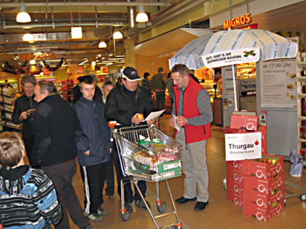 Am vergangenen Samstag standen über 50 Personen für den Verband Thurgauer Landwirtschaft im Einsatz und verteilten an 25 Coop- und Migros-Standorten im Kanton Thurgau Äpfel an die Einkaufenden.