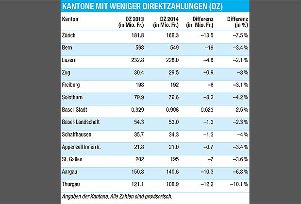 Die Bergkantone konnten 2014 mehr Beiträge auszahlen. Mehrere Kantone in der Talzone – etwa BE, ZH, TG, AG – verloren zusätzlich Gelder, weil sie nicht in der Lage waren, überall Landschaftsqualitätsbeiträge anzubieten.