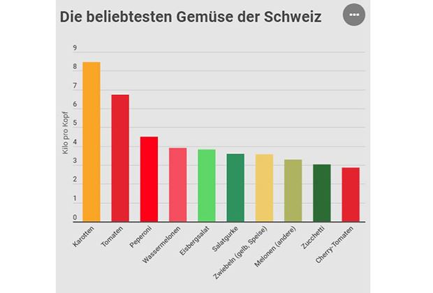 Separat auf Rang 10 liegen die Cherry-Tomaten mit 2,85 Kilo pro Kopf. Würde man diese zu den anderen Tomaten hinzurechnen, könnten sie das Rüebli von der Spitzenposition verdrängen.