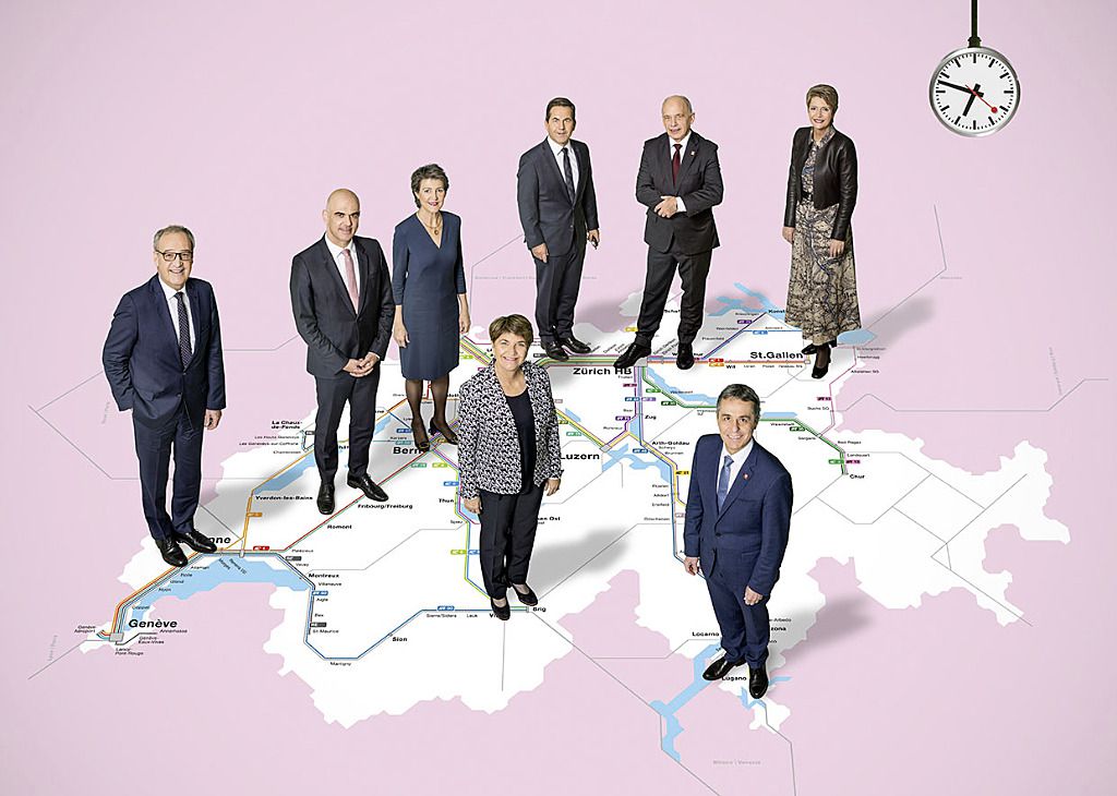Hintergrund des Fotos bildet eine Karte des Schienennetzes mit den wichtigsten Bahnverbindungen, die die Schweiz von Norden nach Süden und von Osten nach Westen durchqueren. Diese Linien verbinden auch die Bundesrätinnen und Bundesräte, die gemäss ihrer Herkunft auf der Karte stehen.