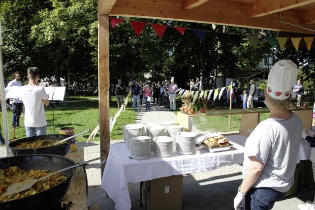 Mit dem Brot wurden für den Apero Crostini mit Peperoni- und Kürbispaste mit herzförmigen Rüeblischeiben und Kräutern vorbereitet. Weiter wurden Haferguetzli, Früchtebrötli, Polentamais-Schnitten angeboten. Aus den Kartoffeln und dem Gemüse wurde ein saisonaler Eintopf gekocht, dazu gab es Salat mit Frischkäse und Apfelschnitzen. Zum Dessert wurden Apfelkuchen und Erdbeeren serviert.