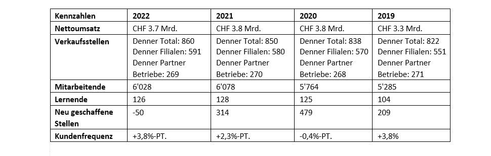 Die Zahl der Mitarbeitenden in den Denner-Betrieben ist im vergangenen Jahr um 50 auf 6028 leicht zurückgegangen. Für sie will die Gruppe im Jahr 2023 die Lohnsumme um insgesamt 2,3 Prozent anheben. Mit diesem Schritt schwäche Denner für die Mitarbeitenden die Auswirkungen der Teuerung ab, heisst es.