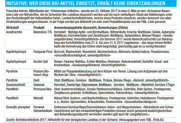 So heisst es denn im Initiativtext, dass für den Bezug von Direktzahlungen eine «pestizidfreie Produktion» verlangt wird, von einer Einschränkung auf chemisch-synthetische Pestizide ist nicht die Rede. Herren orientiert sich am Pestizid-Begriff von Vision Landwirtschaft, die unter der Leitung des Agrarökologen und Bio-Bauern Andreas Bosshard im Mai 2016 schrieb: «Pestizide können synthetischen oder natürlichen Ursprungs (z.B. Pyrethrum, Kupfer) sein.» Vergangene Woche schickte Franziska Herren dem «Schweizer Bauer» eine vorläufige Liste von Bio-Hilfsstoffen, die aus ihrer Sicht Pestizide sind (vgl. Tabelle).