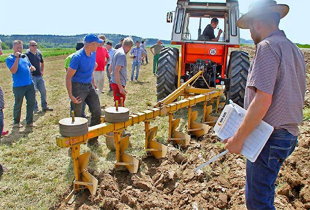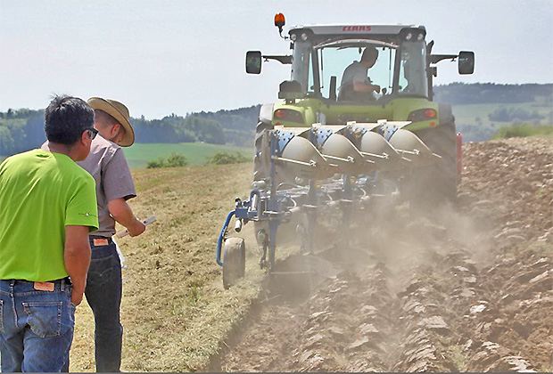 Verschiedene Hersteller und Landwirte präsentierten dabei unterschiedliche Verfahren und Techniken, um die Wiese so zu bearbeiten, dass die Folgekultur angelegt werden kann, ohne dass die bestehende Grasnarbe ein Problem werden könnte. Gastgeber Siegrist setzt dabei auf zwei Verfahren mit Pflügen. Mit dem konventionellen 4-Schar Drehpflug (Vogel& Noot) pflügt er die Wiese bis maximal 20 cm Tiefe. Zudem hat er in Holland einen Beet-Schälpflug (Rumpstad) mit 7 Scharen erworben und umgebaut, welcher einen Umbruch von 10 bis 15 Zentimeter Tiefe ermöglicht.