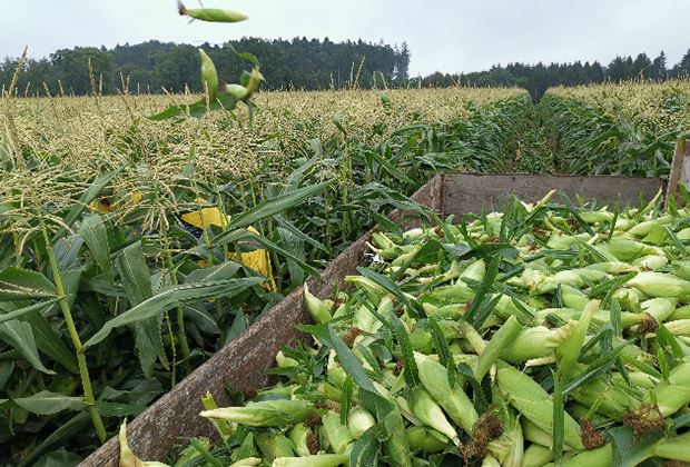 Der Anbau geschieht gestaffelt, so dauert die Ernte über einen Monat. Ausserdem sind die jungen Zuckermais-Pflänzchen heikel und haben nicht gerne nasskaltes Wetter. Der nahegelegene Wald ist für das Abtrocknen der Kolben eher hinderlich. Es sei eigentlich immer mit einem halben Hektar Ausfall zu rechnen, erzählt Susanne Renggli.