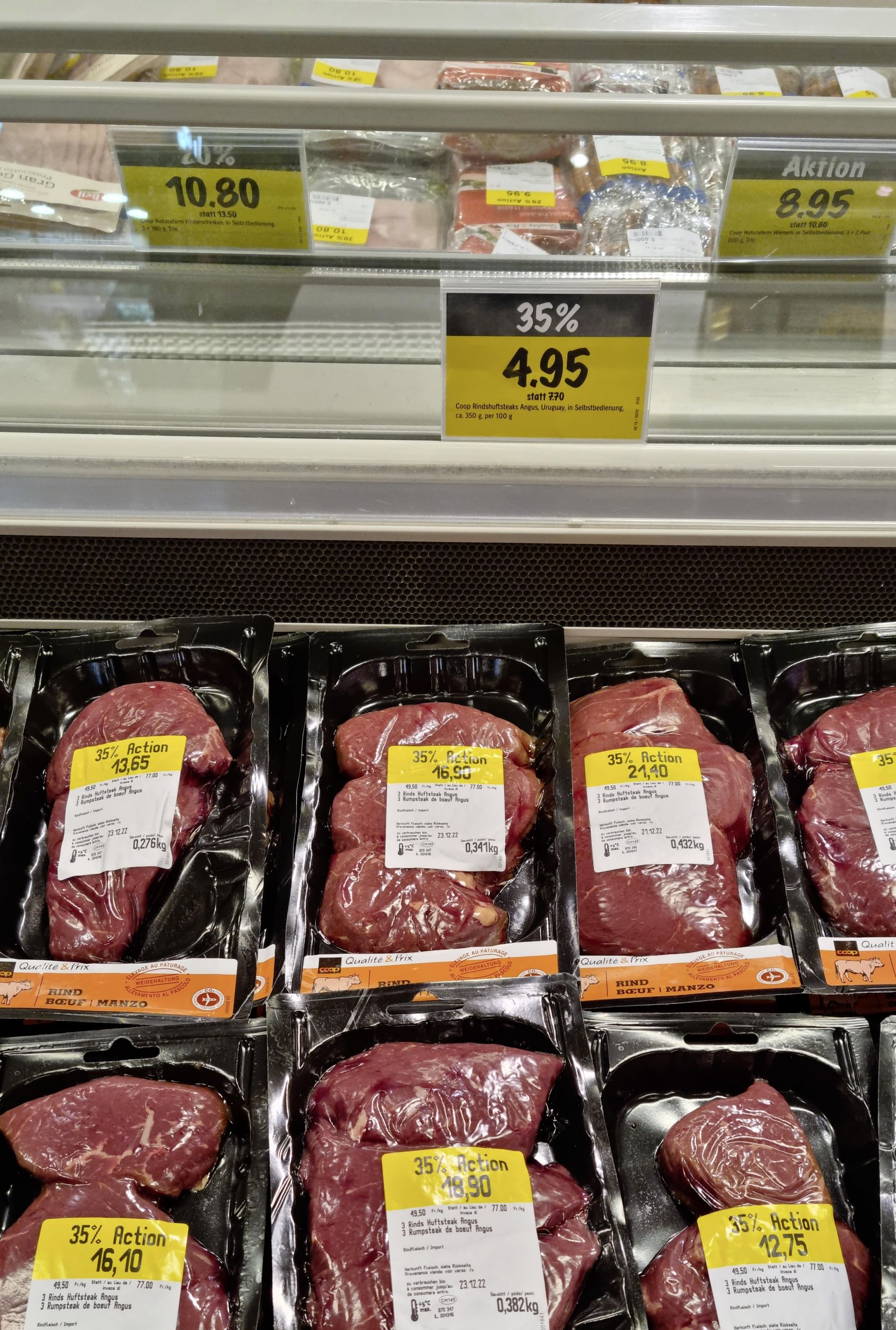 Aktuell ist nicht nur das Importfleisch zu Aktionspreisen erhältlich, auch Schweizer Fleisch – vom Rind über das Kalb bis zum Schwein –- ist günstiger als sonst. So kostet zum Beispiel Schweinsnierstückbraten bei Coop Fr. 1.95 statt Fr. 3.60 pro 100 Gramm. Oder Schweinsschinkli kosten mit Fr. 1.60 statt Fr. 3.20 pro 100 Gramm nur noch halb so viel wie sonst. Oder in der Migros gibts Schweinsfilet zum Aktionsangebot von Fr. 2.95 pro 100 Gramm.