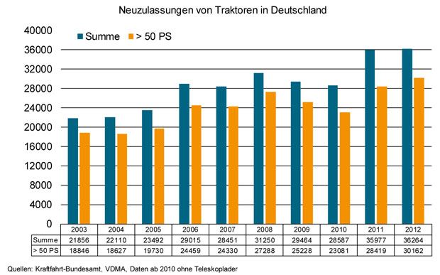 Dieses wieder stärkere Gewicht für die landwirtschaftlich genutzten Traktoren habe auch zur Folge, dass die durchschnittliche Motorleistung der neuen Traktoren auf dem deutschen Markt im Jahr 2012 noch einmal weiter gestiegen seien. Sie lag 2012 mit 93 kW (126 PS) um drei kW höher als im Vorjahr.