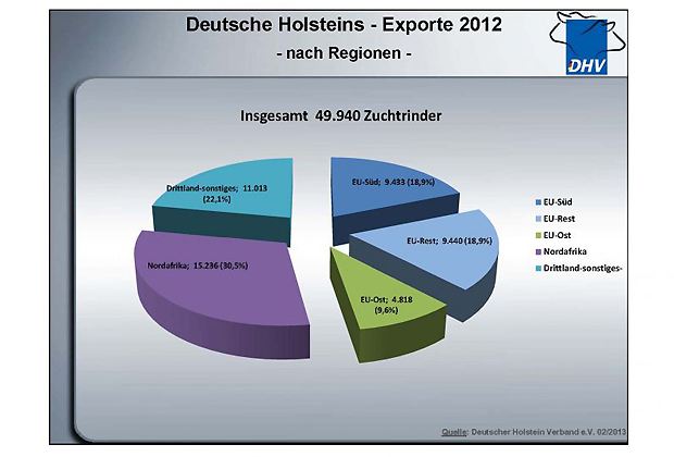 Der Anteil des innergemeinschaftlichen Absatzmarktes sei aufgrund der freien Grenzen von 37% im Jahr 2011 auf 47% im vergangenen Jahr gestiegen. Allerdings mussten auch beim Verkauf von Holstein-Rindern in die EU-Partnerländer deutliche Abstriche