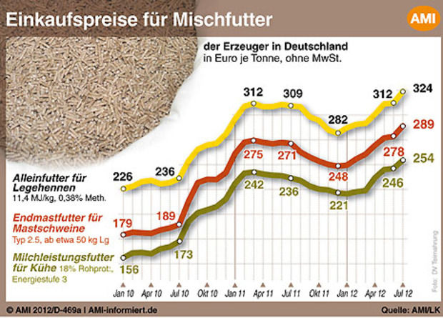 Die Futtermittelpreise haben ungeachtet der laufenden Ernte ihre aufwärts-gerichtete Tendenz beibehalten und sind erneut gestiegen. Mastschwein-, Milchleistungs- und Geflügelfutter wurden in den ersten sieben Monaten 2012 deutlich teurer.