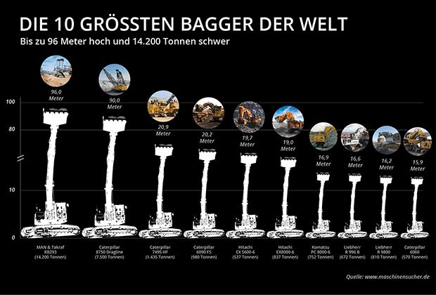 Das Raking "Die 10 grössten Bagger der Welt" wurde nach Einsatzgewicht und nach Metern vorselektioniert.