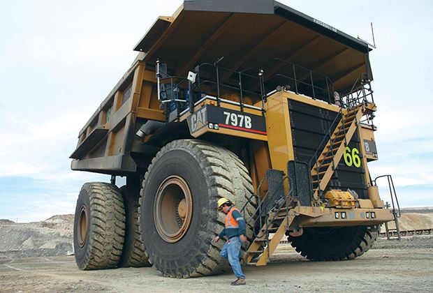 Lastwagen so lang wie ein Schwimmbecken. Reifen, die grösser sind als ein normaler Lkw. Und Trucks, die mehr wiegen als 500 VW Golf. Bei diesen Maschinen braucht es alleine 18 Stufen, um das Führerhaus zu erklimmen.