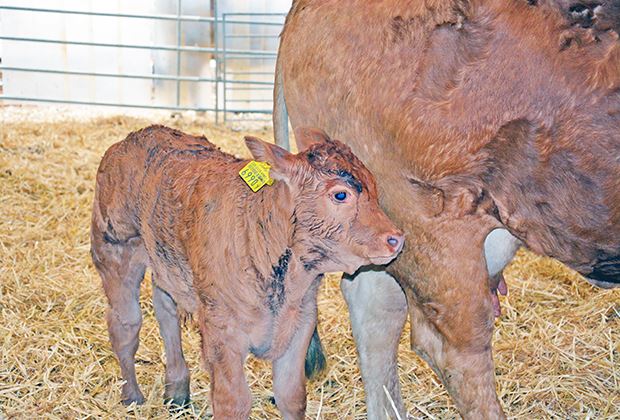 Das Limousin-Kalb Galopin, aus dem Betrieb von Stefan Lobsiger, versteckt sich hinter seiner Mutter Perle.