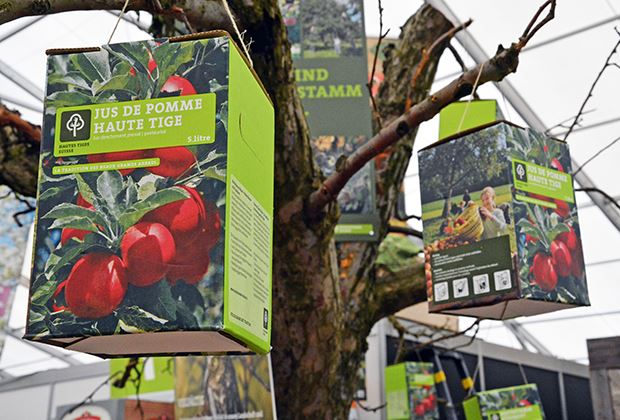 Anstatt Äpfel hängt an der BEA fertiger Apfelsaft an den Bäumen.