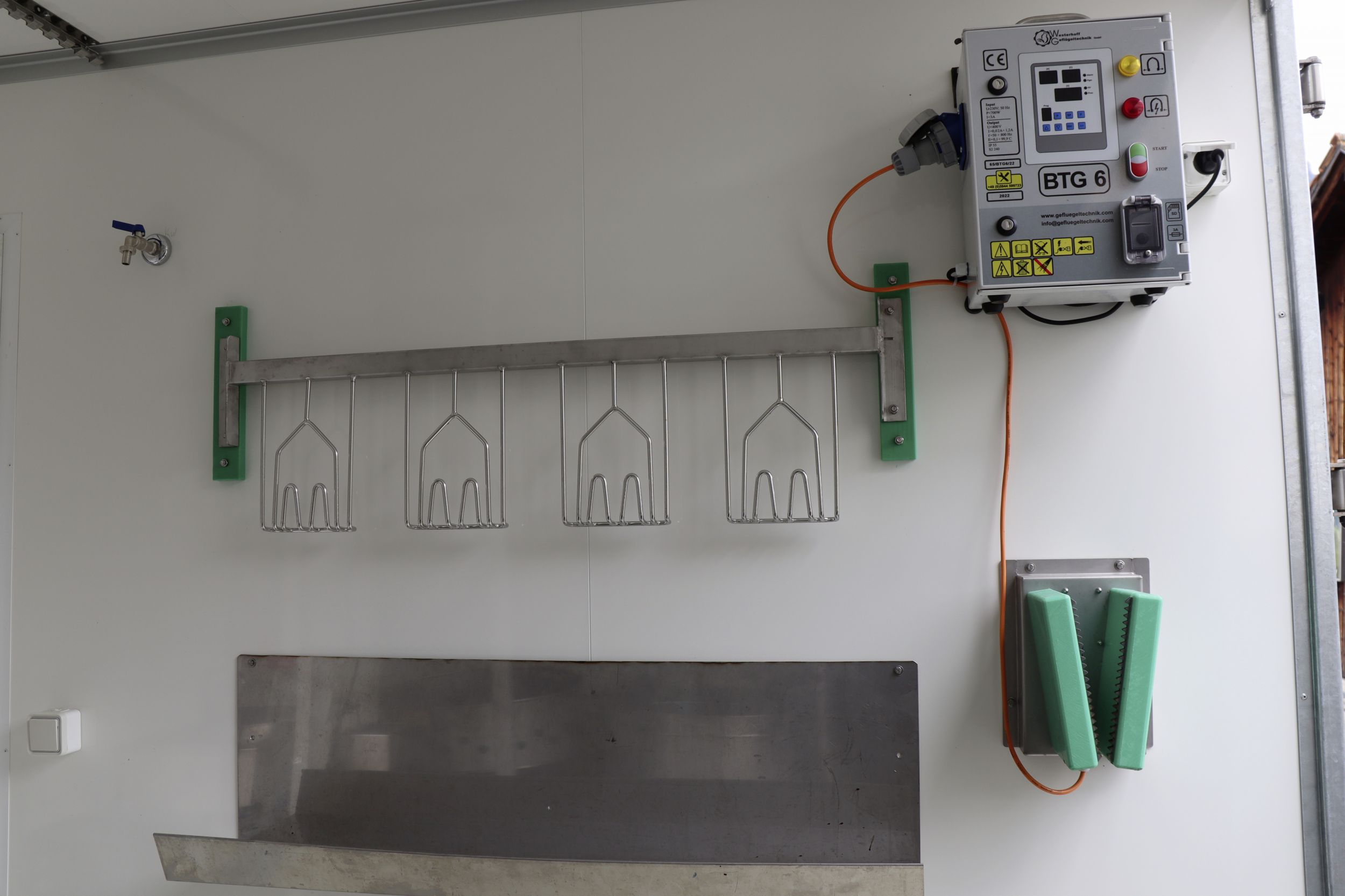 Thomas Leppkes und Natalie Cavelti fahren mit dem Zugfahrzeug und mit dem Anhänger auf dem Hof, bauen die Schlachtanlage auf. Es braucht einen Wasser- und einen Stromanschluss und die Möglichkeit, das Abwasser in die Güllegrube oder die Kanalisation zu leiten. Das Geflügel wird mit Strom betäubt, aufgehängt, es erfolgt der Kehlschnitt, es wird gerupft, gewaschen, geht durch die Schleuse in den hygienischen Bereich, wo es ausgenommen wird, und gelangt dann in den Kühlraum. Die Tiere müssen nicht mehr quer durch die Schweiz transportiert werden, sondern nur noch vom Stall zum Anhänger.