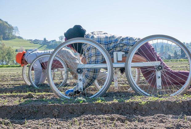 Aber keine Angst: Es werden in den nächsten Tagen keine Motoren auf diesem Acker aufheulen. Denn die Geräte werden nur von reiner Muskelkraft angetrieben. "Mit ihnen jäten die Erntehelfer viel schneller als normal, deshalb der Name", erklärt Lukas Camenzind. Er machte seine Lehre zum Landwirten auf dem Eichhof und ist dort nun für den neuen Betriebszweig "Lohnjäten" verantwortlich.