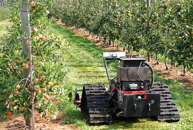 Ein Team der Robot Makers GmbH in Kaiserslautern (D) entwickelt Steuersysteme für Pflegearbeiten wie Spritzen oder Mulchen. Die Steuerungen lassen sich auf Trägerfahrzeuge aufbauen; die Kosten für die Steuerung liegen in der Grössenordnung von 25'000 Franken. Die Robotertechniker führten das Mulchen mit einem Aebi-Raupenfahrzeug vor. Es findet den Weg durch die Obstreihen selbst. Ziel ist es, die Arbeiten in der Obstplantage am Vortag zu planen und die Maschinen am andern Tag diese autonom durchführen zu lassen.