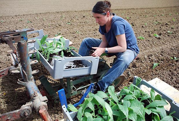 Immer wenn der Impuls ertönt, drückt sie die Pflanze vorsichtig und präzis in die vorbereitete Furche. Einmal nimmt sie die Pflanze mit der rechten, das nächste Mal mit der linken Hand aus dem halbleeren Plastikharass. Eine Verschnaufpause liegt nicht drin, regelmässig mahnt der Taktgeber zur längst automatisierten Handbewegung der flinken Biobäuerin. Die gegen 80 Aren, die Reutimann’s jährlich mit Artischocken anpflanzen, werden in mehreren Tranchen gestaffelt bepflanzt.