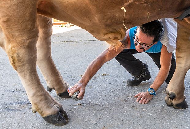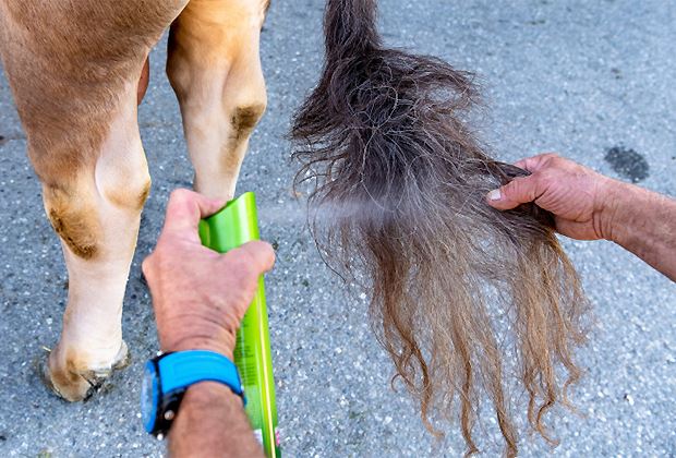 Der Siegermuni wird mit dem Hochdruckreiniger gewaschen und anschliessend einschamponiert. Die Haare zwischen den Hörnern und am Schwanz werden gebürstet und mit Haarspray in Form gebracht. Die Hörner werden mit Melkfett poliert und die Klauen mit schwarzer Farbe eingesprüht.