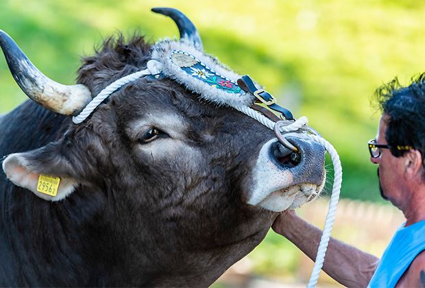 Der Original Braunvieh-Stier ist eindrücklich. Der 1200 Kilo schwere Kolin lebt auf der Hof Weidmatt von Otto Nussbaumer. Sein Bruder, Mändel Nussbaumer, widmet sich jeden Samstag dem Siegermuni zu.
