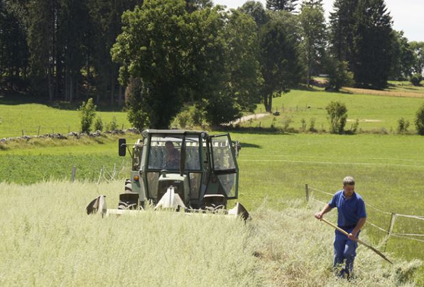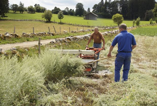 Das meiste kann mit dem Frontmäher und Ladewagen gemäht werden, doch manche Felder und Ecken sind so schmal, dass dafür der Motormäher eingesetzt werden muss. Während ihr Mann Heinz mit dem Frontmäher über das Feld fährt, schneidet Marlise am Rand die restlichen Stängel von Hand. Nach der Ernte werden die Wermutstauden runter geschnitten. Dieser Säuberungsschnitt erleichtert das Jäten im nächsten Frühling.