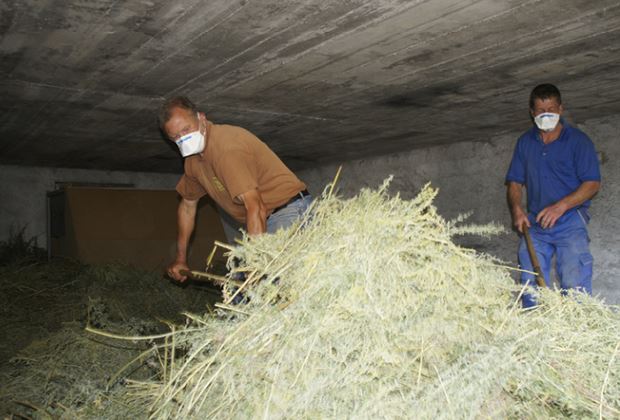 Nach der Ernte wird der Wermut mit dem Ladewagen zur Trocknungsanlage gefahren, die ein paar Höfe entfernt liegt. Für 3-4 Tage kommt das Kraut zum Trocknen in den Entfeuchter, damit es danach gut gehäckselt werden kann. Das Häckseln ist wichtig, um die holzigen Stängel von den feinen Blüten und Blättern zu trennen. Denn nur die Blüten und Blätter werden für die Destillation gebraucht.