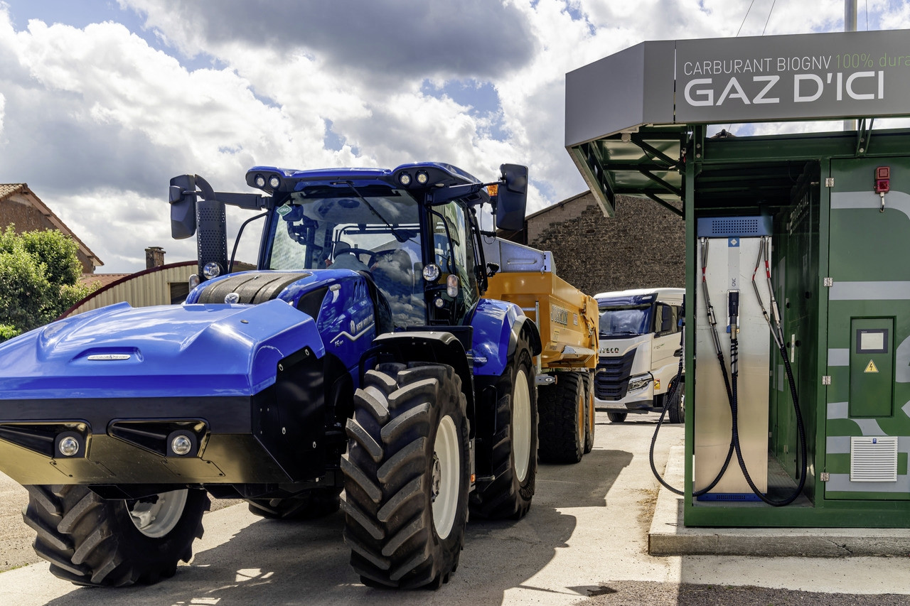 New Holland profitierte bisher schon von der langjährigen Erfahrung der Konzernschwester Iveco/FPT und brachte 2022 mit dem T6.180 Methane Power als erster Hersteller einen Serientraktor mit Gasmotor auf den Markt. Das Methan wird hier gasförmig in Form von CNG (Compressed Natural Gas) in Druckbehältern mitgeführt. Da die Energiedichte von CNG pro Liter Tankvolumen im Vergleich zu Diesel bei nur rund einem Fünftel liegt, sind die Einsatzzeiten von solchen Fahrzeugen generell eingeschränkt.