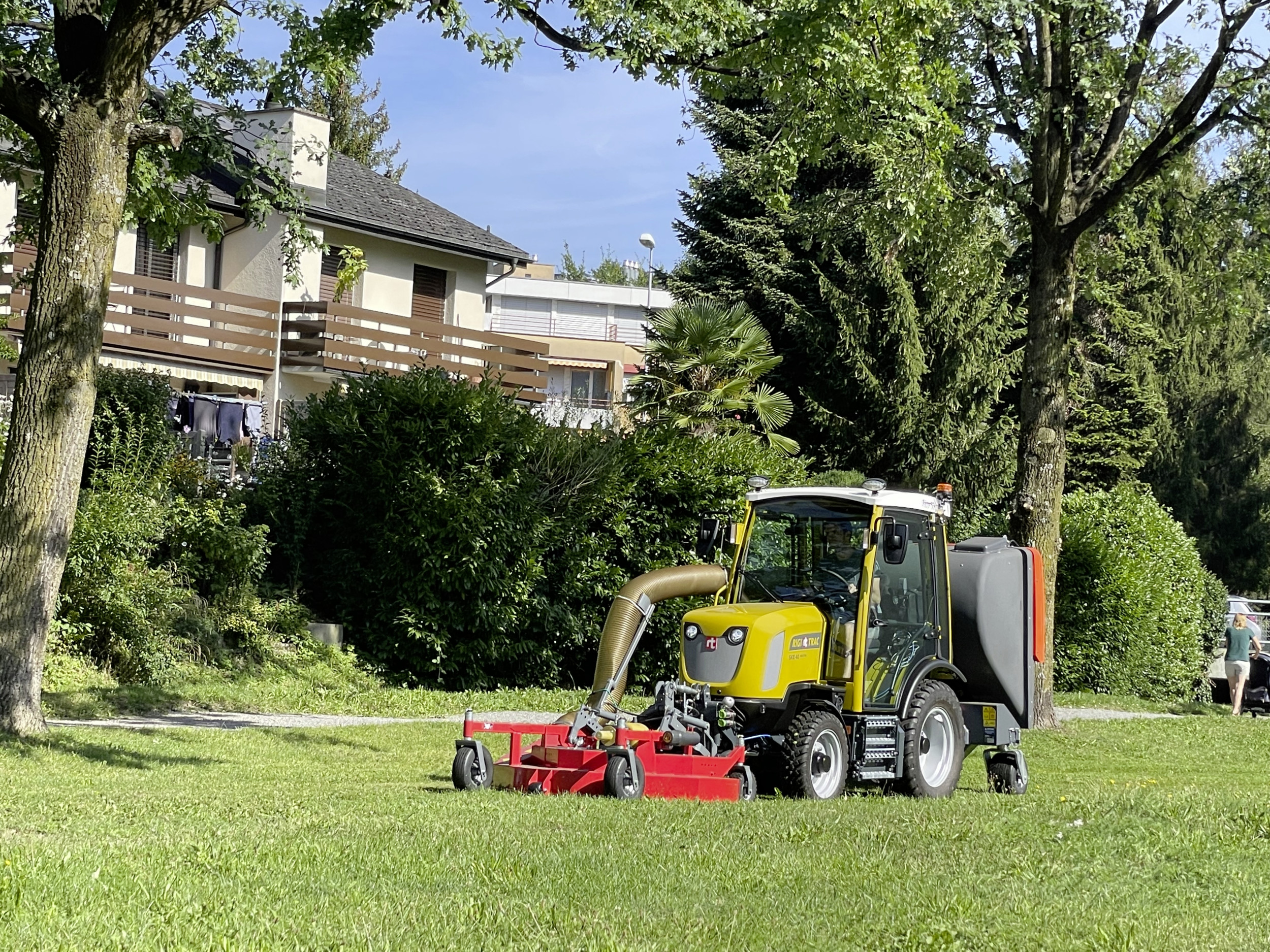 Der neuere Rigitrac SKE 40 Electric beim Mähen im kommunalen Einsatz.