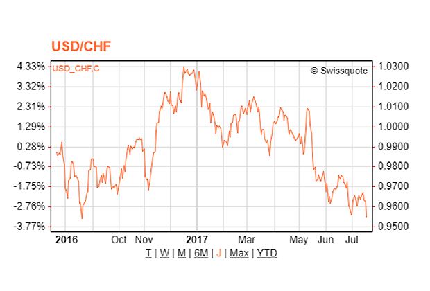 Die Regionalbank Valiant führt die Dollar-Schwäche auf die bisher gescheiterte Gesundheitsreform der US-Regierung zurück. Dies habe den Dollar deutlich belastet. Er leide zudem auch unter schwachen Konjunkturdaten. Dies verunsichere die Anleger und dämpfe die Zinshoffnungen. «Infolge der jüngst schwächeren US-Konjunkturdaten und der etwas weniger restriktiven Äusserungen der US-Notenbankvorsitzenden Janet Yellen ist die implizite Wahrscheinlichkeit einer weiteren Zinserhöhung dieses Jahr auf 40 Prozent gefallen», kommentierte die Credit Suisse.