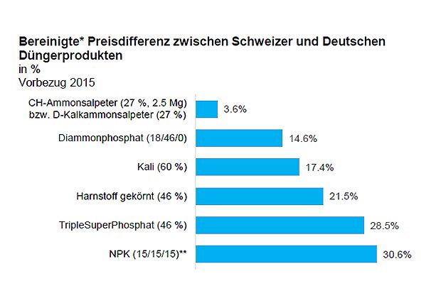 Die Schweizer Landwirtschaft gibt jährlich 211 Mio. Franken für Dünger aus. Das entspricht 3,3 Prozent der Gesamtausgaben für landwirtschaftliche Vorleistungen. Der Bericht der Marktexperten zeigt teils erhebliche Preisunterschiede zwischen der Schweiz und Deutschland auf. Gemäss BAK Basel (2014) und Branchenexperten werden rund 70 Prozent des Mineraldüngers importiert.