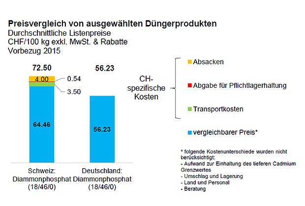Die höheren Preise in der Schweiz werden auch auf die Einhaltung von strengeren Grenzwerte zurückgeführt. BAK Basel (2014) schätzt den Aufwand um Cadmium konformer Dünger zu beschaffen mit 8 Franken pro Tonne. Ins Feld geführt werden auch höhere Transportkosten. Diese werden auf 3.50 Fr. pro 100 kg beziffert, sie variieren aber von Region und Bestellmenge.
