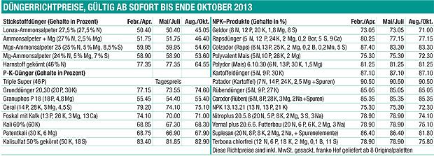 Aber auch bei den Stickstoffdüngern spreche alles dafür, dass die internationalen Preise noch weiter fallen, so «DLG». Die Firma Yara, eine der weltweit grössten Stickstoffdüngerherstellerinnen, schreibt jedoch auf Anfrage, dass sie in den nächsten Monaten von stabilen Stickstoffpreisen ausgehe. Mit dem zunehmenden Verbrauch im Frühjahr 2014 könnten die Preise wieder ansteigen.