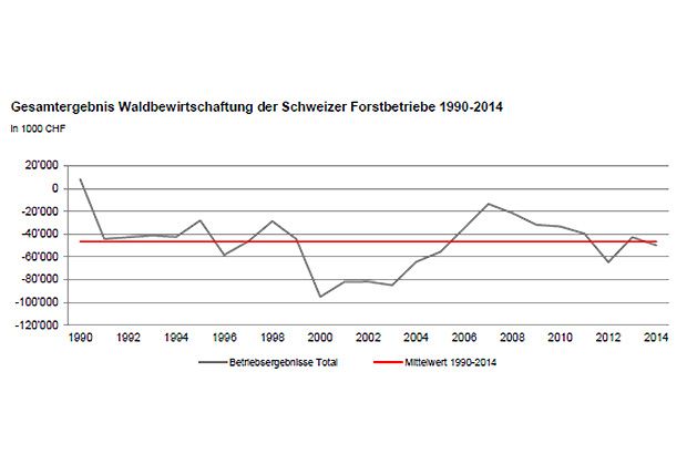 Das Gesamtergebnis hat sich mit einer Unterdeckung von rund 50 Millionen Franken gegenüber dem Vorjahr wieder verschlechtert. Leicht höheren Holzerlösen standen höhere Kosten in der Holzernte und tiefere Erlöse bei der Produktion von Sachgütern, wie beispielsweise Stückholz und Hackschnitzel gegenüber. Laut dem forstwirschaftlichen Testbetriebsnetz des BAFU resultierte 2014 für die Waldbesitzer ein Verlust von durchschnittlich 8 Franken pro Kubikmeter Holz.