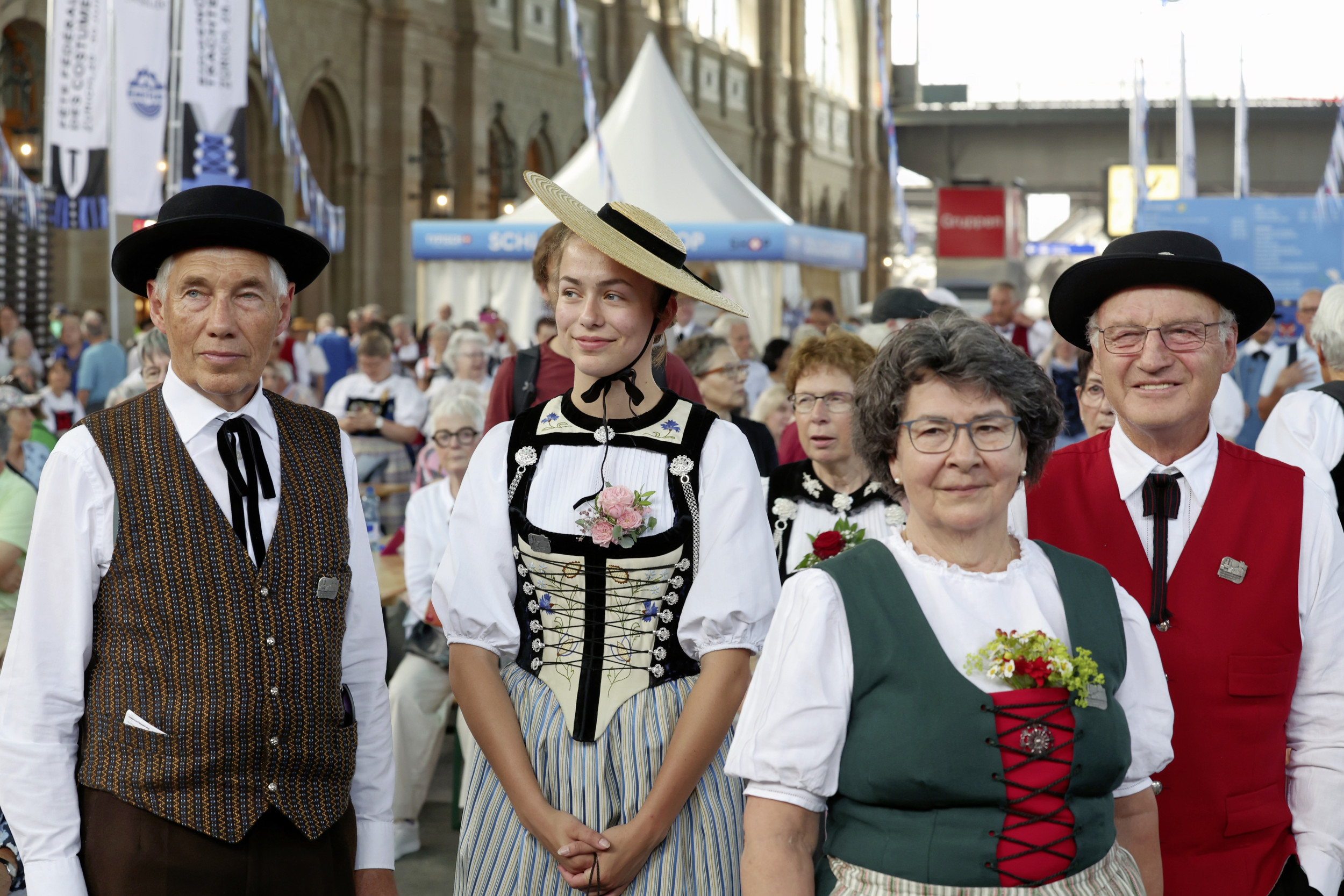Zum offiziellen Start des Eidgenössischen Trachtenfests (ETF) hatte zuvor in der betriebsamen, pulsierenden Halle des Zürcher Hauptbahnhofs die Stadtmusik Zürich mit Tambouren aufgespielt – sie startete natürlich mit dem Sechseläutenmarsch.