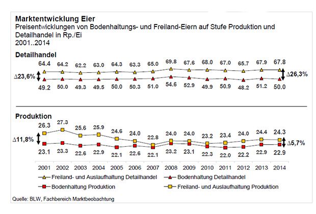 Im Jahr 2001 hatte der Preisunterschied noch 11,8 Prozent (3,2 Rp./Ei) betragen, 2014 lag er nach einem zwischenzeitlichen Anstieg 2009 bei 6,3 Prozent (1,4 Rp./Ei), wie der aktuelle Marktbericht des Fachbereichs Marktbeobachtung des BLW zeigt.