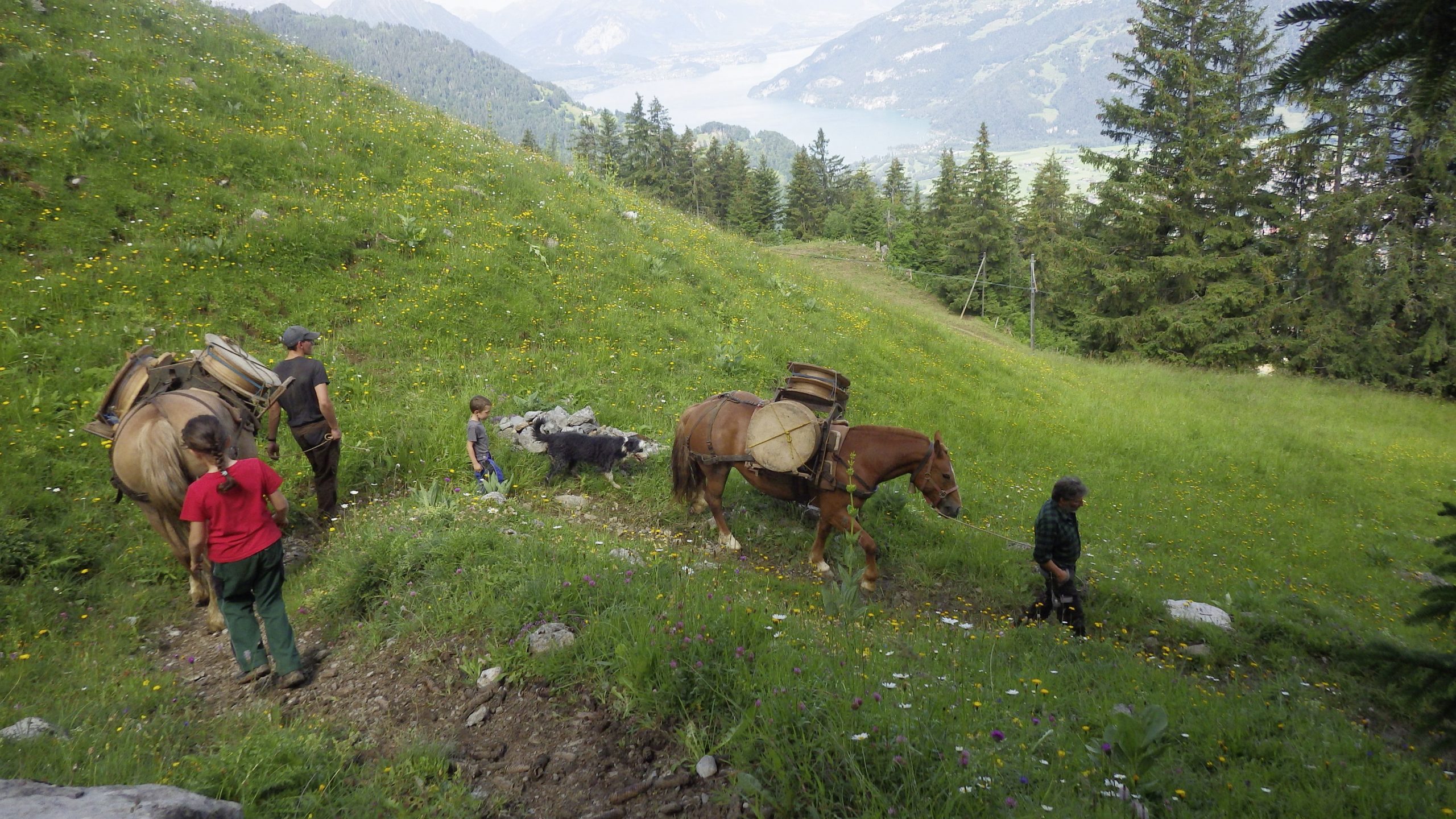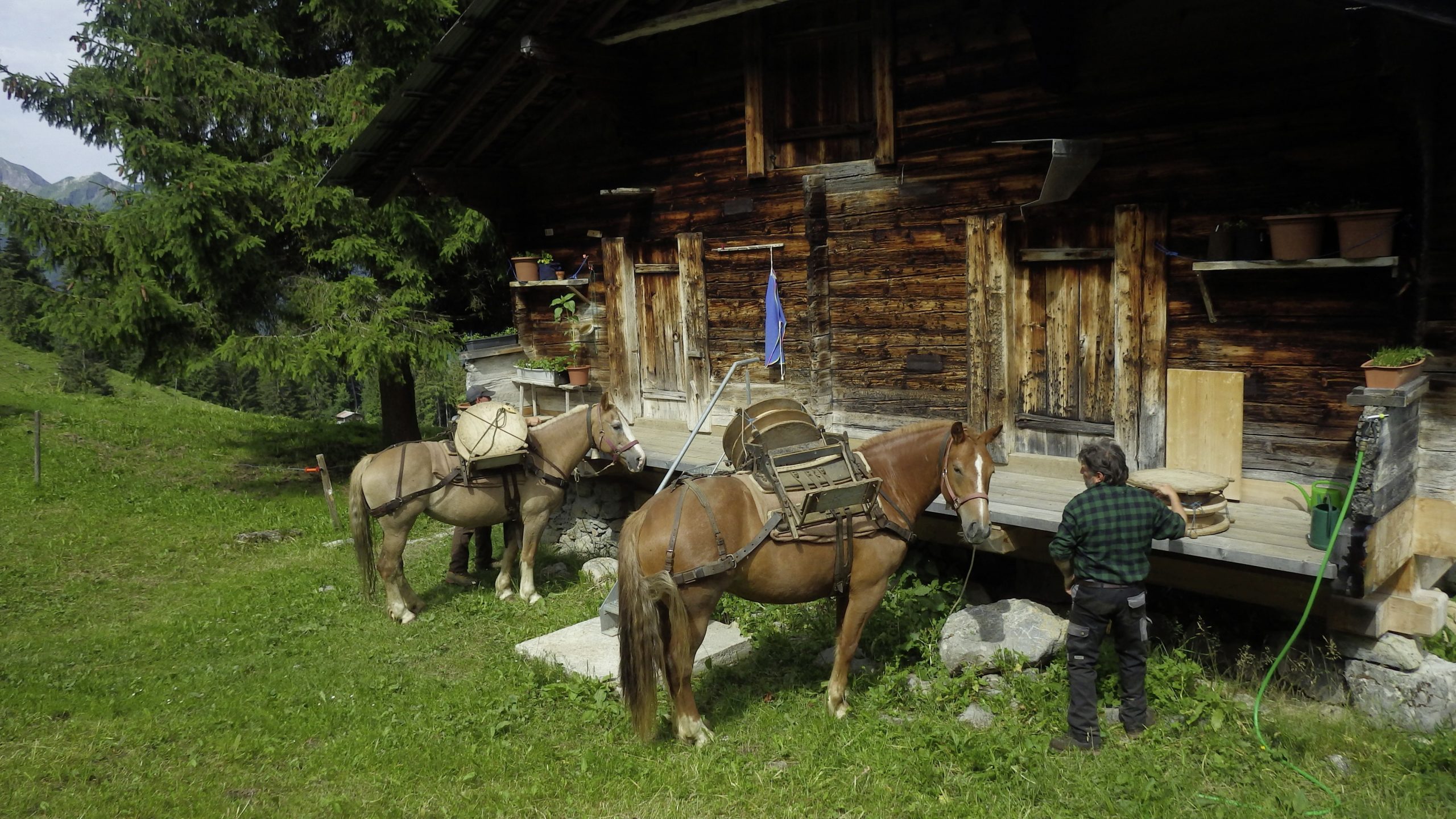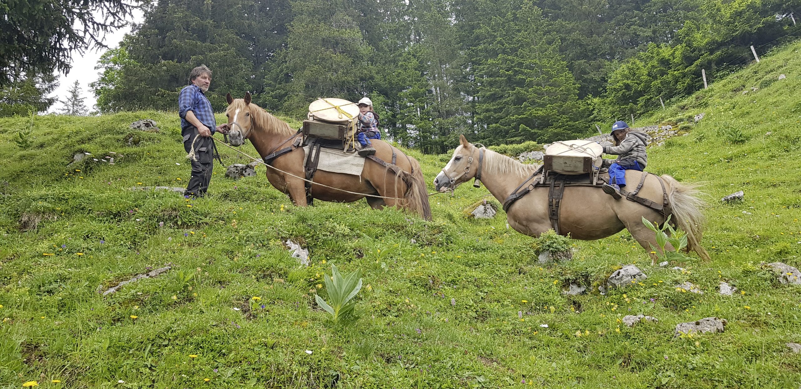 Im Hochsommer, wenn im oberen Stafel auf 1540 Höhenmetern gekäst wird, basten die Freiberger Stute Jeannette und ihre Tochter Jamilia jeden Tag den frischen Käse von Breitlauenen in den Käsespeicher, der neben der unteren Hütte im Schürläger auf 1381 Metern über Meer steht. Für Elena und ihren kleinen Bruder Balz ist das die schönste Arbeit. Die Geschwister helfen beim Satteln und können es fast nicht erwarten, dass die gut verpackten Käse vom Vortag auf die Bastsättel gebunden werden.