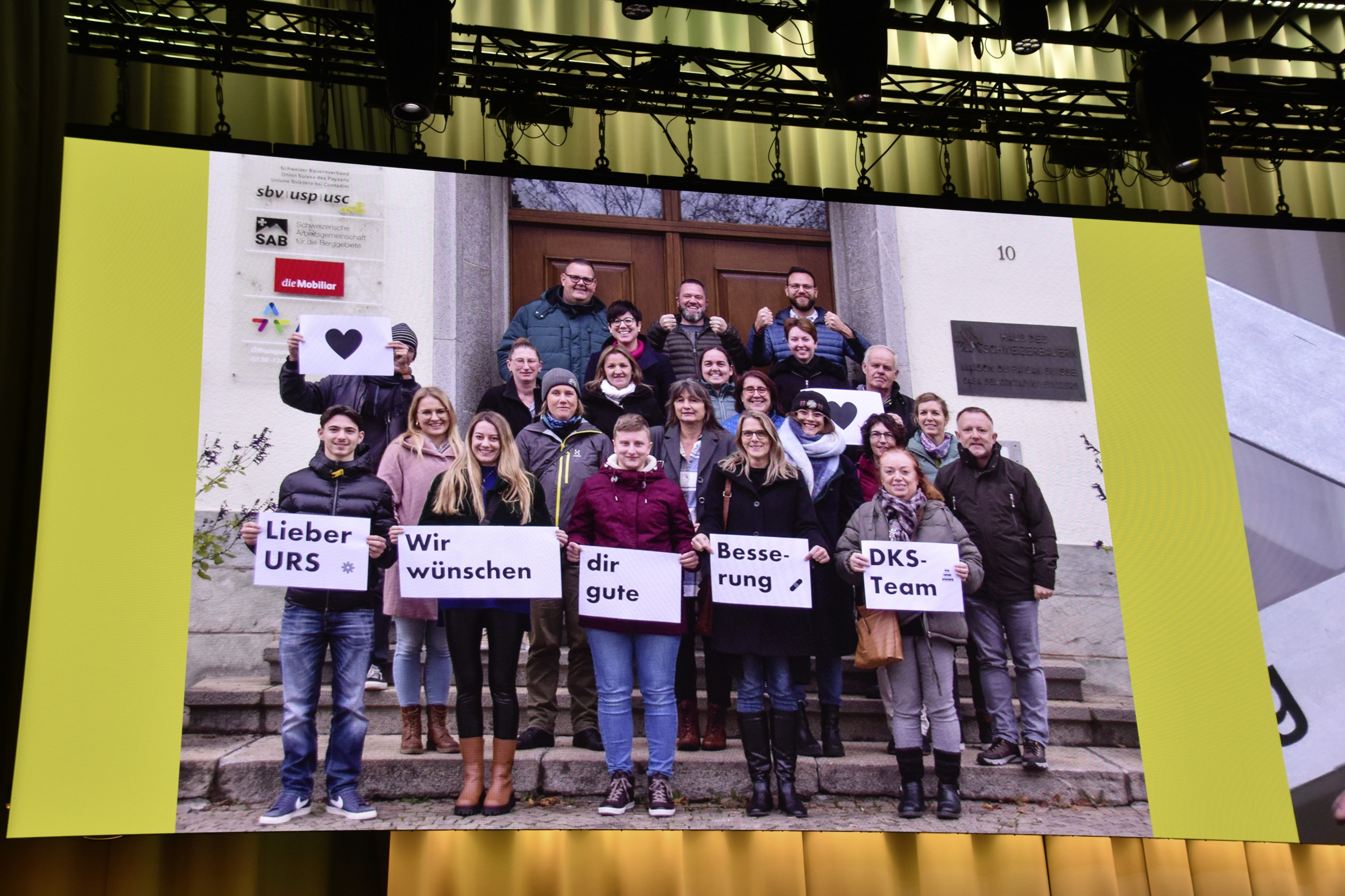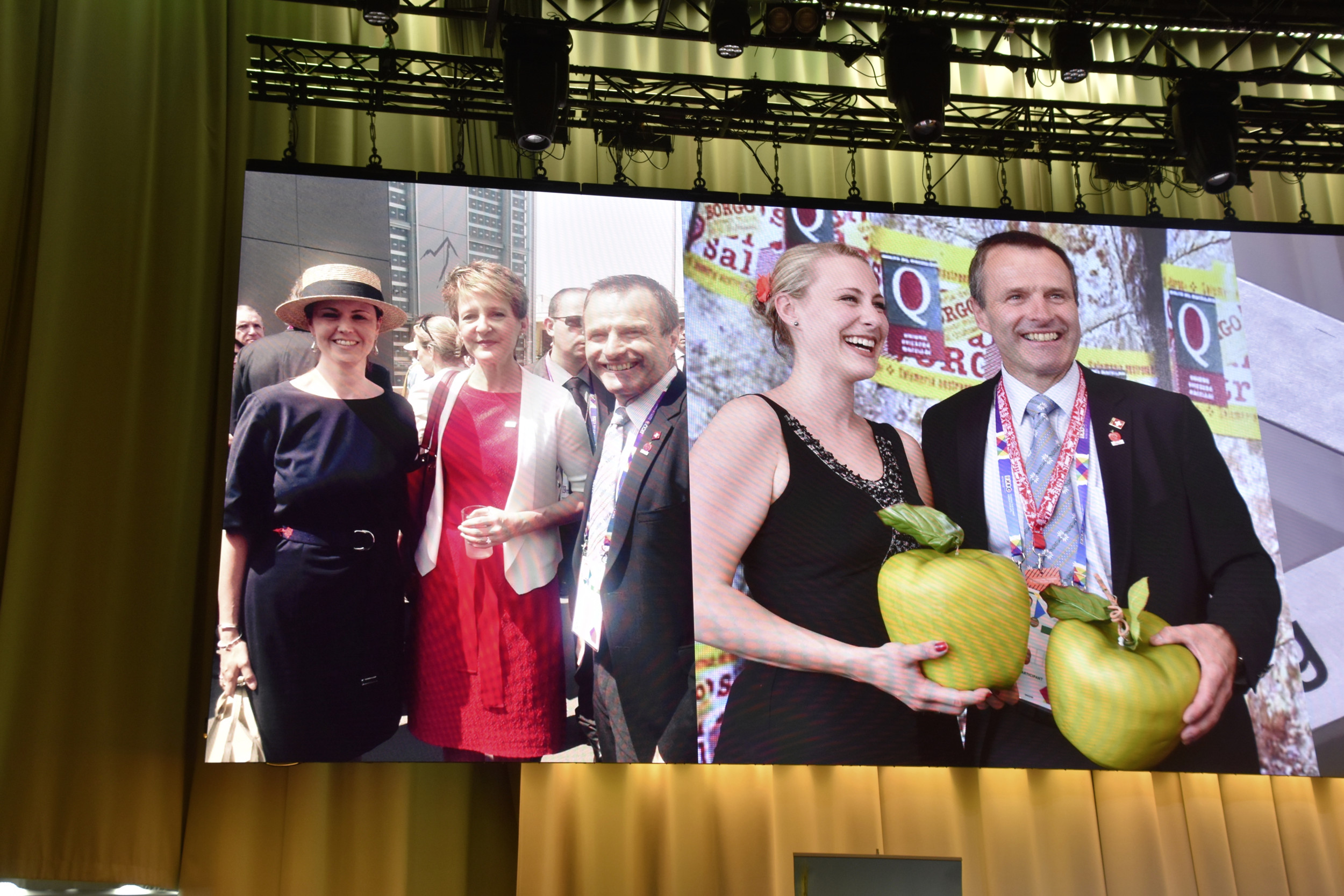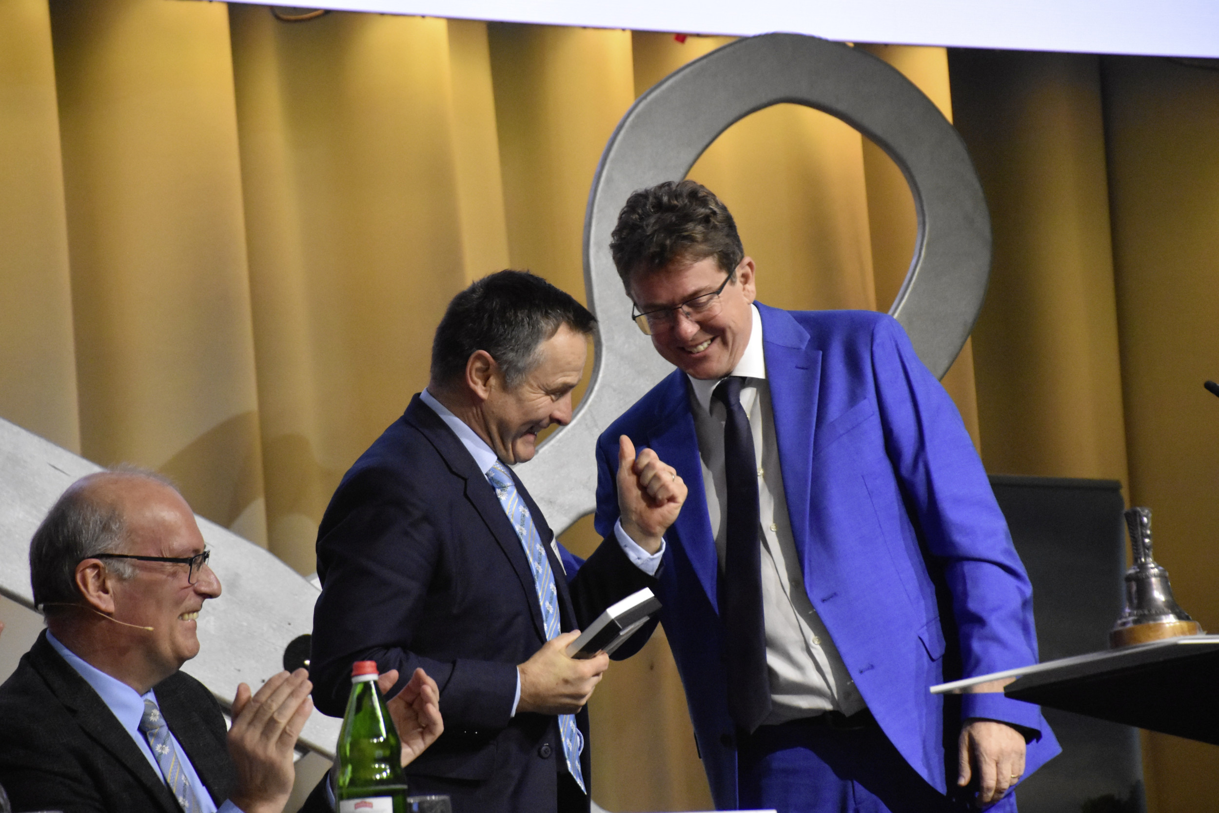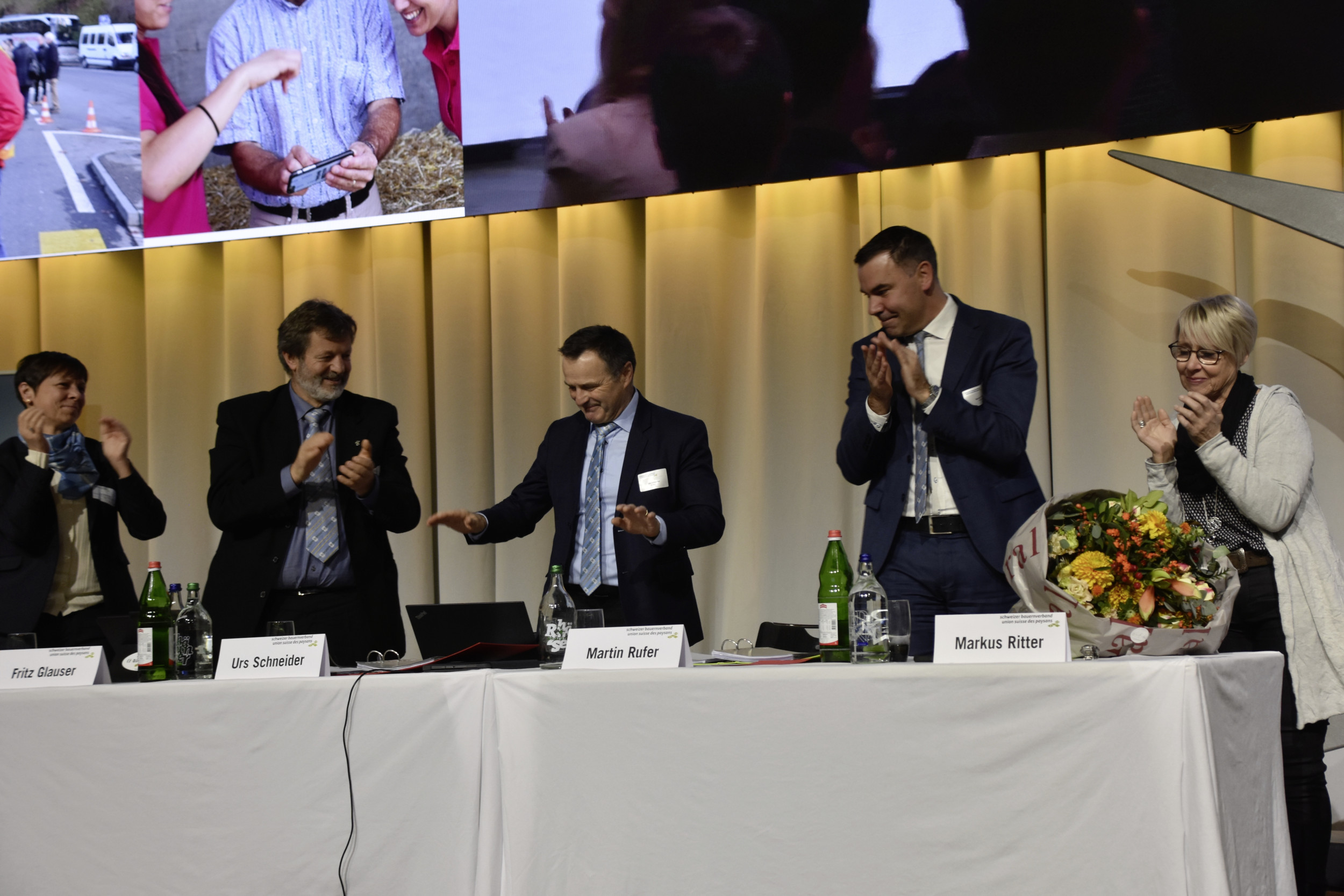 Irgendwie gehe es immer, und wenn es nicht gehe, suche man einen Weg, bis man am Ziel sei, habe Urs jeweils gesagt. Und selbst wenn er selbst Hand anlegen musste. Er hat viele Pfähle selbst eingeschlagen und auch selbst plakatiert. «Und nur wer mit gutem Beispiel vorangeht, kann auch die andern mitziehen, das weiss er auch aus seiner militärischen Karriere. Lieber Urs, auch von meiner Seite und im Namen aller Schweizer Bauernfamilien, ein riesengrosses Merci für Dein grosses Werken und Wirken. Ich bitte nun um einen tosenden Applaus für Urs Schneider!» Der Applaus wurde zur Standing Ovation, das Präsidium des SBV erhob sich, und sämtliche fast 400 Delegierten und zahlreiche Mitarbeiter des SBV und zahlreiche Gäste.