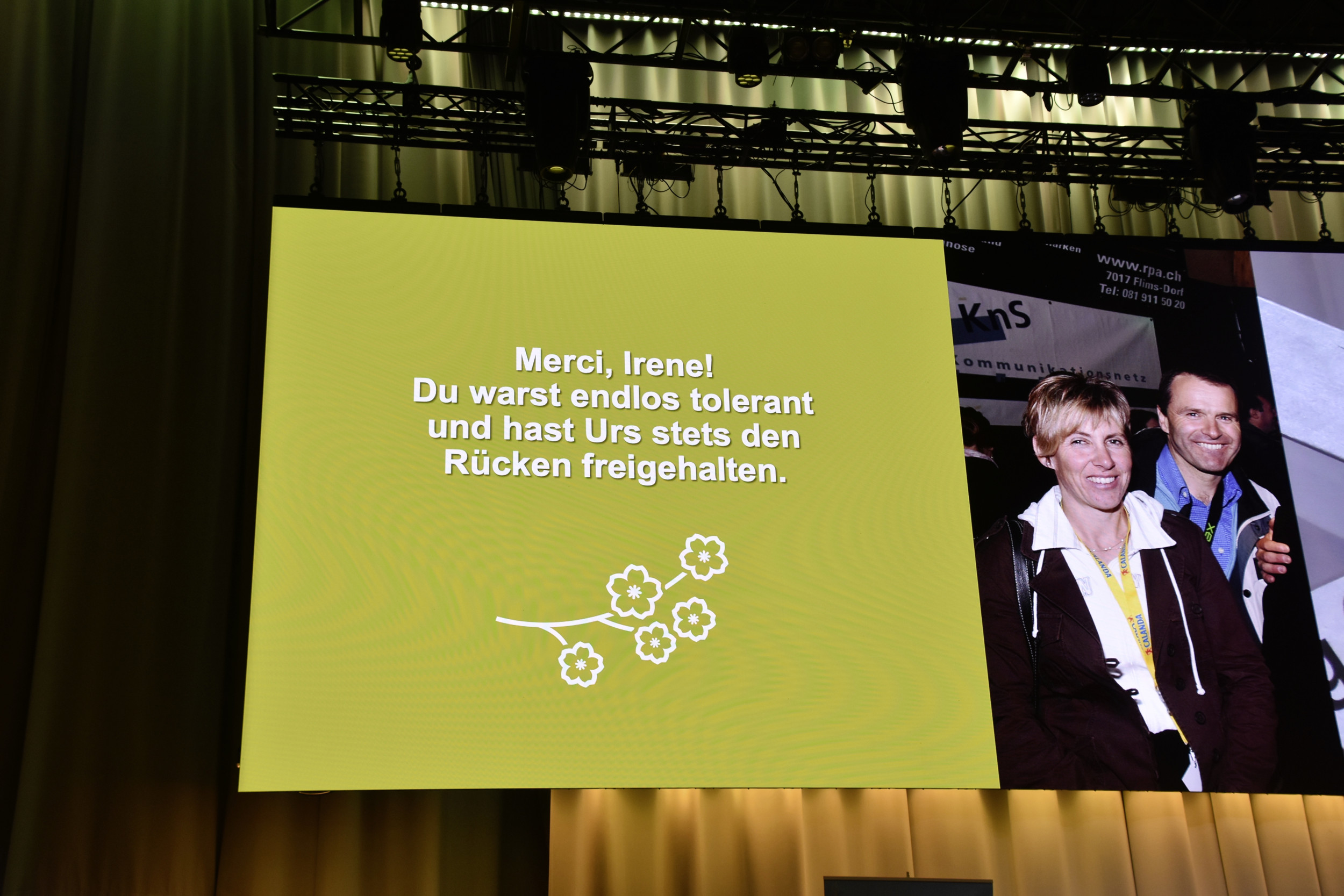Urs Schneider trat ans Rednerpult und sagte: «Ja, ich bin jetzt wirklich etwas erschlagen. Das erste Mal war heute Morgen, als meine Frau hier erschienen ist. Damit habe ich wirklich überhaupt nicht gerechnet. Wir haben ja beim Bauernverband dann auch noch einen Abschied. Ich dachte, dass sie vielleicht dorthin eingeladen wird, aber dass sie sogar heute an die DV eingeladen ist, freut mich ganz speziell. Denn ihr gehört der grösste Dank.»