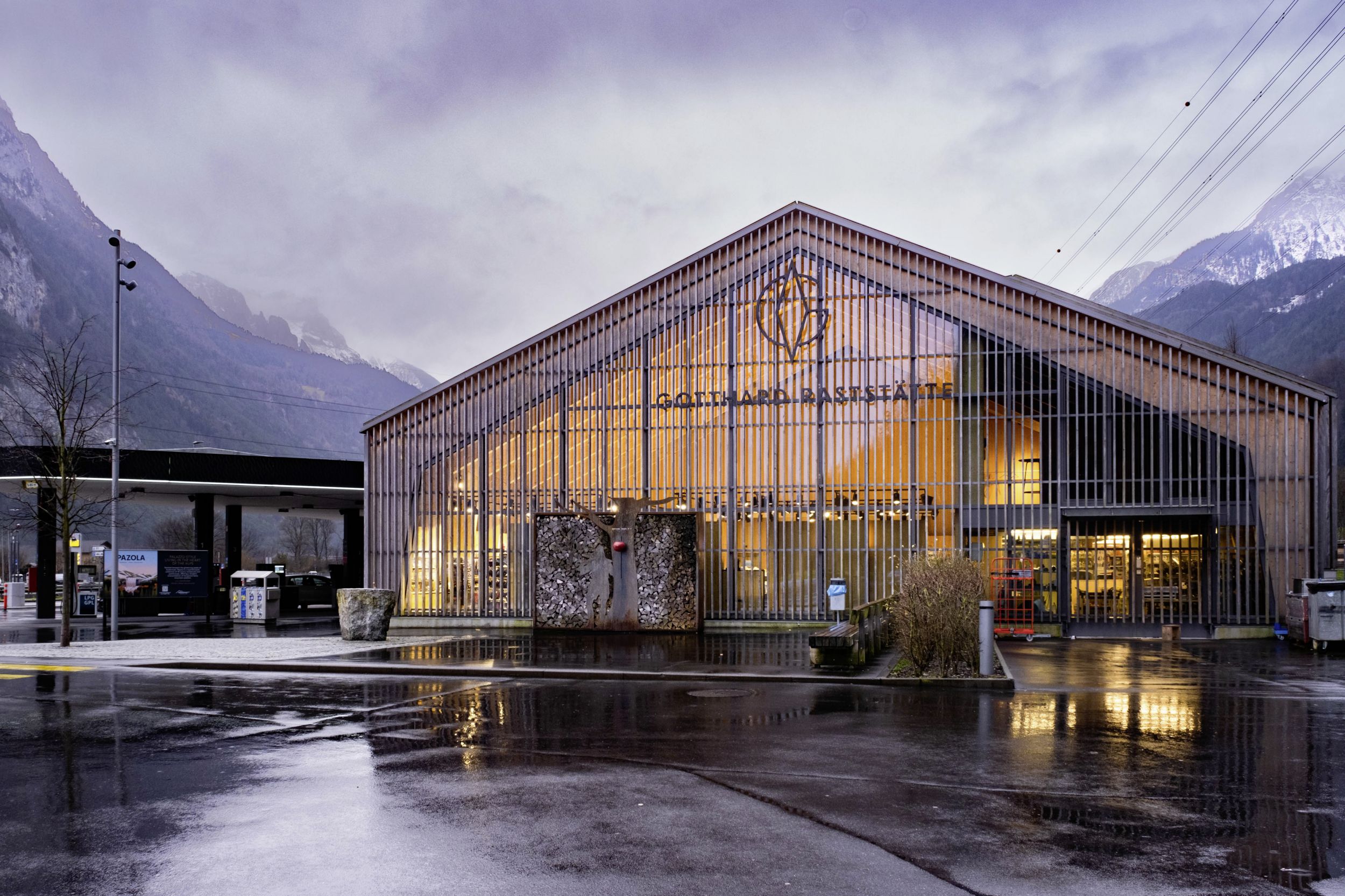 Sie ist einen Halt wert, die Gotthard-Raststätte Süd im Kanton Uri. Von hier aus sind es noch wenige Kilometer bis zum Eingang des Gotthardtunnels. Die Raststätte wurde im Stil der traditionellen Urner Ställe errichtet.