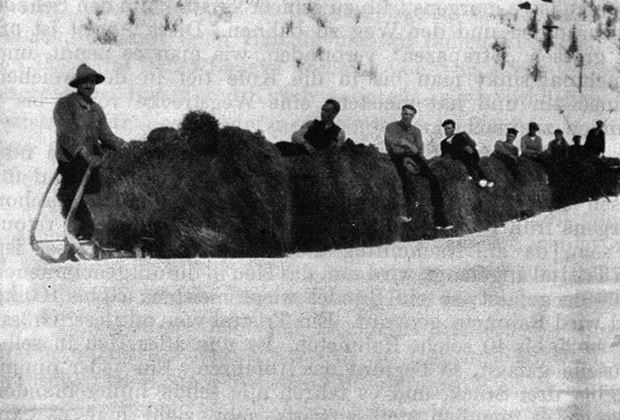 Aus diesem Eis schlugen die angeseilten Bergbauern mit Steigeisen an ihren Schuhen eine Art Bobbahn, auf der der von einem todesmutigen Mann gesteuerte Heuschlitten dann gleiten konnte. Bis zu 300 Kilo wogen die Heuballen. Auf den steilen Weiden steuerte ein Mann den Schlitten, ein anderer bremste die Ladung mit einem Seil, das um einen Pflock geschlungen war.
