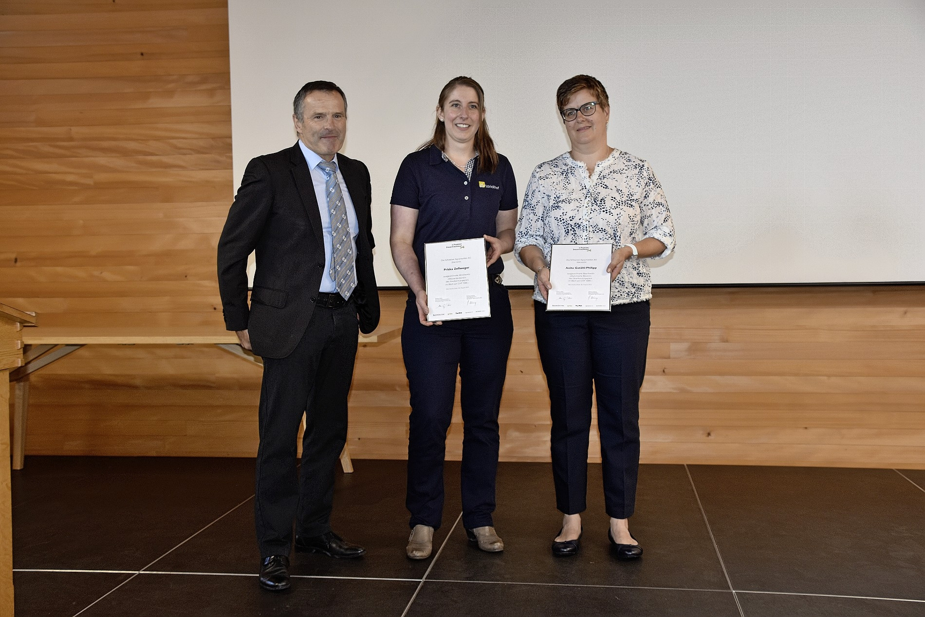 An der Abschlussfeier hat Priska Zellweger (Mitte) auch einen Preis der Agrarmedien überreicht bekommen. Aufgrund ihrer Note 5,9 wurde sie an der Feier für einen Moment ins Zentrum gestellt.